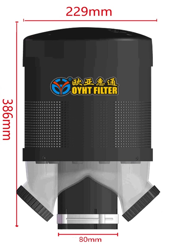 Мультициклонный предочиститель воздуха OYHT Filter PL400 ⌀80мм дл двигателей 50-90 Л.С. Циклонный воздушный предочиститель мультициклон для ДВС 50-90 л.с. диаметр 80 мм на трактор МТЗ Беларусь Lovol Foton Dongfeng Zoomlion Shifeng Xingtai Yanmar Файтер Скаут Агромаш Уралец Русич. Эффективность фильтрации до 98% при запыленности 1 грамм на 1 м3 воздуха. При правильном подборе продлевает срок службы воздушного фильтра до 6-8 раз. ВНИМАНИЕ ! оптимальный подбор предочистителя осуществляется по расходу воздуха м3/ мин Данный предочиститель для ДВС с расходом воздуха 3,6-6,5 м3/ мин. Фильтр циклонный предварительной очистки с диаметром 80 мм предназначен для с двигателями мощностью 50-90 л.с. Он эффективно очищает поступающий воздух от пыли, грязи и других частиц, защищая двигатель от преждевременного износа. Устройство устанавливается на впускной тракт двигателя и обеспечивает стабильную работу мотора в любых условиях. Благодаря своей конструкции, предочиститель увеличивает ресурс воздушного фильтра и повышает эффективность работы двигателя. Устройство не имеет механических движущихся частей, что снижает возможность поломок. Высокая производительность и долговечность Установить предочиститель можно самостоятельно всего за 15 минут. Установка осуществляется на стандартную трубу воздухозаборника без изменений в заводской конструкции. По мере заполнения контейнера для сбора пыли его необходимо опорожнять. В результате: Экономия времени: воздушный фильтр нужно будет чистить реже. Экономия средств: срок службы воздушного фильтра увеличивается. Вес предочистителя 2,32 кг