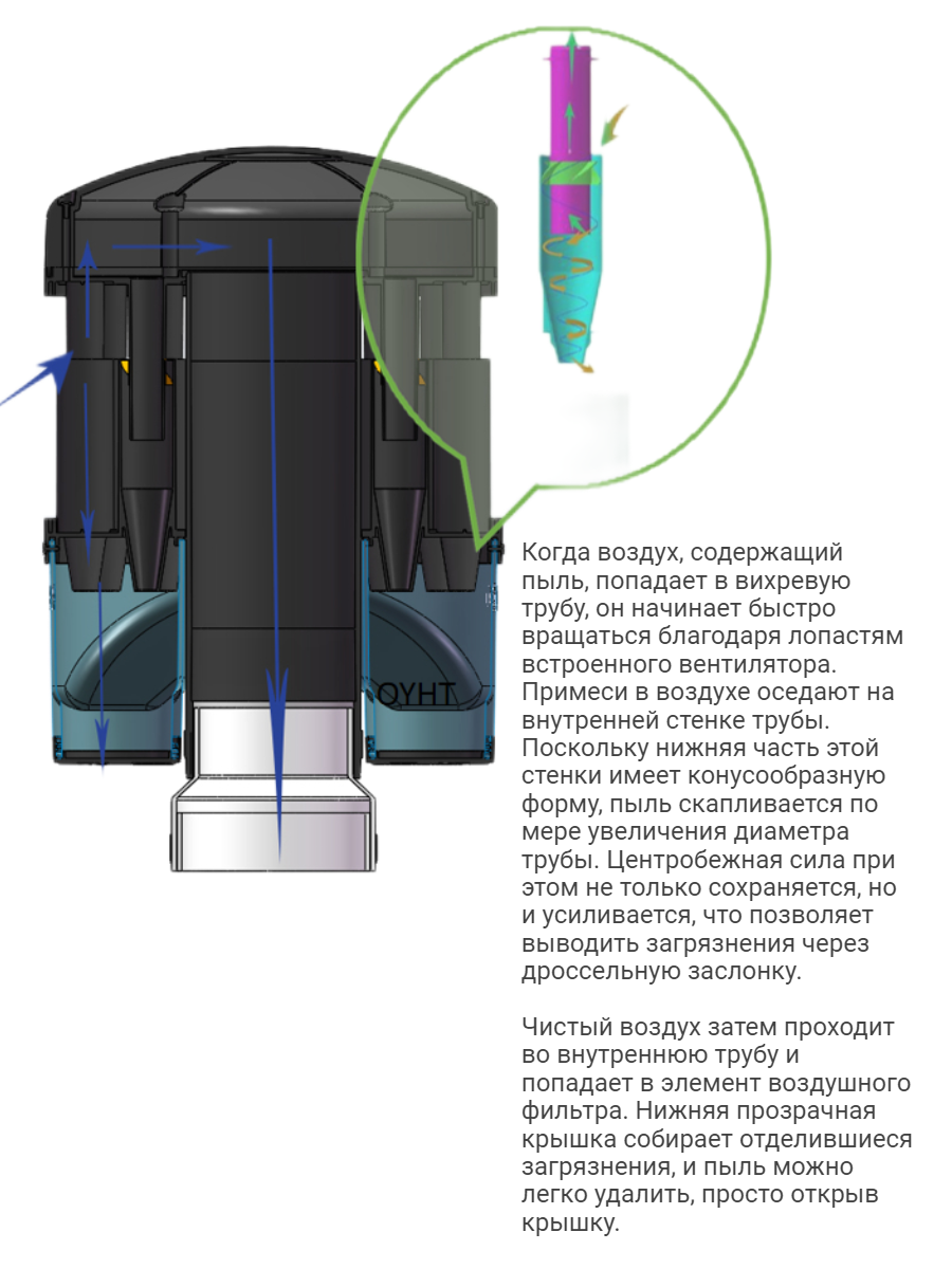 Циклонный воздушный предочиститель мультициклон OYHT PL2000 для ДВС 320-500 л.с.. диаметр 178 мм на трактор РСМ-2375, Кировец К700, Lovol Foton Dongfeng Zoomlion Shifeng Xingtai Yanmar Файтер Агромаш John Deere Комбайн Вектор Аккрос Ростсельмаш Нива Эффективность фильтрации до 98% при запыленности 1 грамм на 1 м3 воздуха. При правильном подборе продлевает срок службы воздушного фильтра до 6-8 раз. ВНИМАНИЕ ! оптимальный подбор предочистителя осуществляется по расходу воздуха м3/ мин Данный предочиститель для ДВС с расходом воздуха 23-36 м3/ мин. Формулу расчета расхода воздуха смотрите на изображении в карточке товара Циклонный воздушный предочиститель с диаметром 178 мм предназначен для с двигателями мощностью 320-500 л.с л.с. Он эффективно очищает поступающий воздух от пыли, грязи и других частиц, защищая двигатель от преждевременного износа. Устройство устанавливается на впускной тракт двигателя и обеспечивает стабильную работу мотора в любых условиях. Благодаря своей конструкции, предочиститель увеличивает ресурс воздушного фильтра и повышает эффективность работы двигателя. Фильтр циклонный предварительной очистки не имеет механических движущихся частей, что снижает возможность поломок. Высокая производительность и долговечность Установить предочиститель можно самостоятельно всего за 15 минут. Установка осуществляется на стандартную трубу воздухозаборника без изменений в заводской конструкции. По мере заполнения контейнера для сбора пыли его необходимо опорожнять. В результате: Экономия времени: воздушный фильтр нужно будет чистить реже. Экономия средств: срок службы воздушного фильтра увеличивается. Вес предочистителя 10,38кг