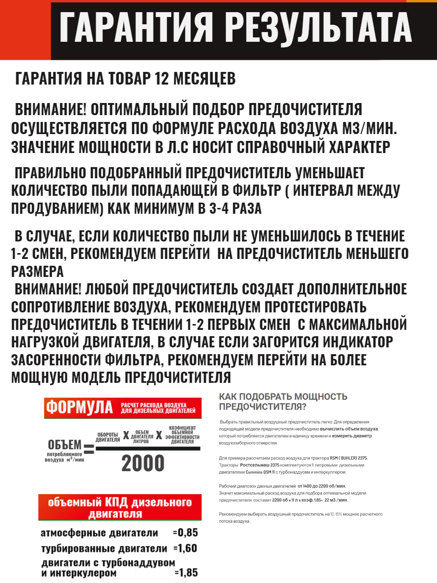 Циклонный воздушный предочиститель мультициклон OYHT PL2000 для ДВС 320-500 л.с.. диаметр 230 мм на трактор РСМ-2375, Кировец К700, Lovol Foton Dongfeng Zoomlion Shifeng Xingtai Yanmar Файтер Агромаш John Deere Комбайн Вектор Аккрос Ростсельмаш Нива Эффективность фильтрации до 98% при запыленности 1 грамм на 1 м3 воздуха. При правильном подборе продлевает срок службы воздушного фильтра до 6-8 раз. ВНИМАНИЕ ! оптимальный подбор предочистителя осуществляется по расходу воздуха м3/ мин Данный предочиститель для ДВС с расходом воздуха 23-36 м3/ мин. Формулу расчета расхода воздуха смотрите на изображении в карточке товара Циклонный воздушный предочиститель с диаметром 230 мм предназначен для с двигателями мощностью 320-500 л.с л.с. Он эффективно очищает поступающий воздух от пыли, грязи и других частиц, защищая двигатель от преждевременного износа. Устройство устанавливается на впускной тракт двигателя и обеспечивает стабильную работу мотора в любых условиях. Благодаря своей конструкции, предочиститель увеличивает ресурс воздушного фильтра и повышает эффективность работы двигателя. Фильтр циклонный предварительной очистки не имеет механических движущихся частей, что снижает возможность поломок. Высокая производительность и долговечность Установить предочиститель можно самостоятельно всего за 15 минут. Установка осуществляется на стандартную трубу воздухозаборника без изменений в заводской конструкции. По мере заполнения контейнера для сбора пыли его необходимо опорожнять. В результате: Экономия времени: воздушный фильтр нужно будет чистить реже. Экономия средств: срок службы воздушного фильтра увеличивается. Вес предочистителя 10,38кг