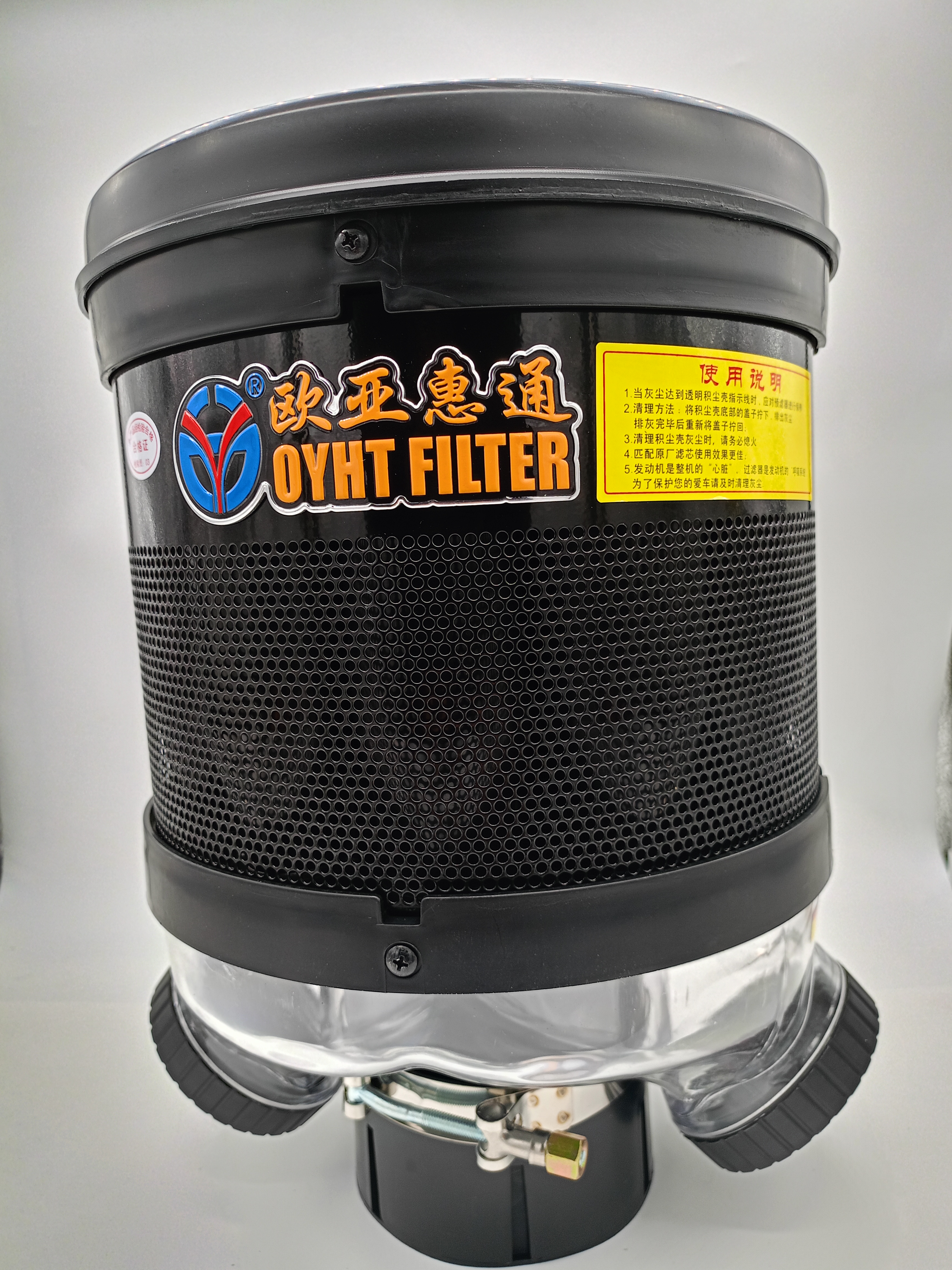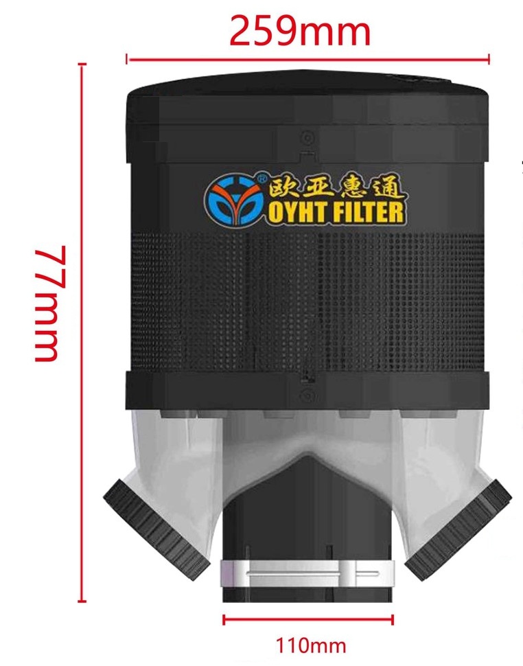 Мультициклонный предочиститель воздуха OYHT Filter PL820 ⌀100мм 80-130 Л.С. Циклонный воздушный предочиститель мультициклон для ДВС 80-130 л.с. диаметр 100 мм на трактор МТЗ Беларусь Lovol Foton Dongfeng Zoomlion Shifeng Xingtai Yanmar Файтер Скаут Агромаш Уралец Русич. Эффективность фильтрации до 98% при запыленности 1 грамм на 1 м3 воздуха. При правильном подборе продлевает срок службы воздушного фильтра до 6-8 раз. ВНИМАНИЕ ! оптимальный подбор предочистителя осуществляется по расходу воздуха м3/ мин Данный предочиститель для ДВС с расходом воздуха 6-9 м3/ мин. Циклонный воздушный предочиститель с диаметром 100 мм предназначен для с двигателями мощностью 80-130 л.с. Он эффективно очищает поступающий воздух от пыли, грязи и других частиц, защищая двигатель от преждевременного износа. Устройство устанавливается на впускной тракт двигателя и обеспечивает стабильную работу мотора в любых условиях. Благодаря своей конструкции, предочиститель увеличивает ресурс воздушного фильтра и повышает эффективность работы двигателя. Фильтр циклонный предварительной очистки не имеет механических движущихся частей, что снижает возможность поломок. Высокая производительность и долговечность Установить предочиститель можно самостоятельно всего за 15 минут. Установка осуществляется на стандартную трубу воздухозаборника без изменений в заводской конструкции. По мере заполнения контейнера для сбора пыли его необходимо опорожнять. В результате: Экономия времени: воздушный фильтр нужно будет чистить реже. Экономия средств: срок службы воздушного фильтра увеличивается. Вес предочистителя 2,66 кг